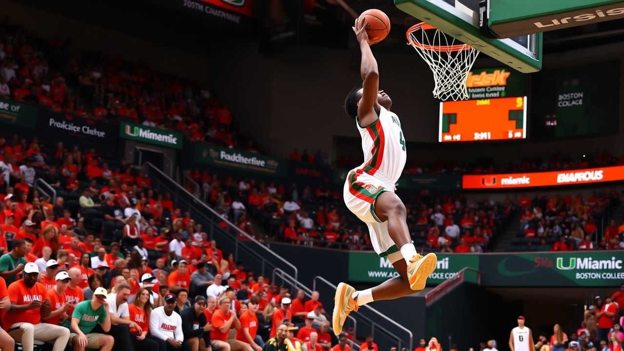 Henderson ha contribuito con 19 punti, mentre Donaldson ha totalizzato 14 punti, otto rimbalzi e sette assist per Miami (18-5, 7-3 ACC). Hand, che ha realizzato quattro tiri da tre, ha segnato 20 punti prima di uscire per falli con meno di tre minuti rimanenti. Boden Kapke ha messo a referto 18 punti e 11 rimbalzi, e Fred Payne ha aggiunto 11 punti per Boston College (9-14, 2-8).