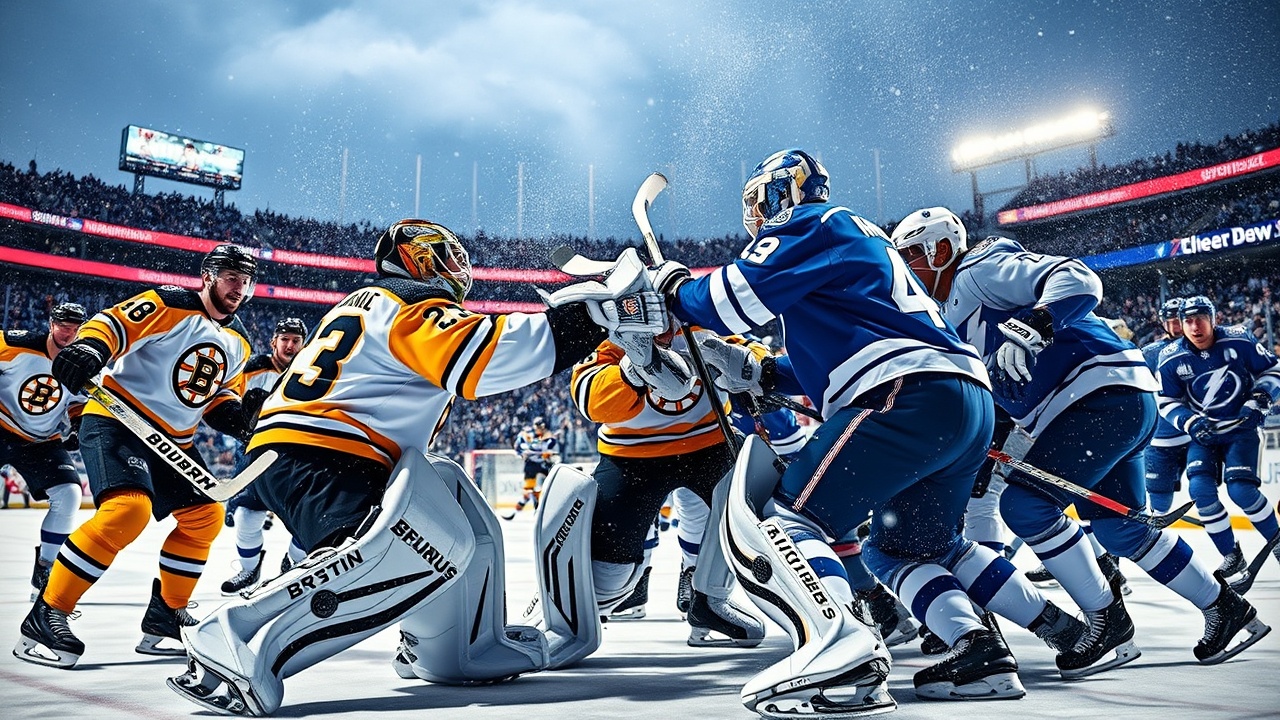 Il primo gioco all’aperto nella storia di Tampa ha avuto un bonus inaspettato: una rissa tra portieri. Jeremy Swayman dei Boston Bruins e Andrei Vasilevskiy dei Tampa Bay Lightning si sono affrontati nel secondo periodo, con Boston in vantaggio 5-2 e le tensioni alle stelle.