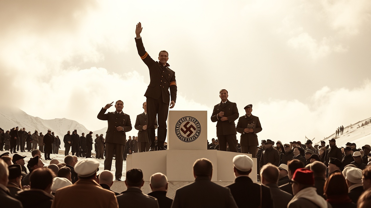La Germania — che gareggiava sotto la bandiera della svastica e poteva contare su sciatori esperti dall’Austria annessa — e l’Italia controllata da Mussolini hanno conquistato tutte le medaglie alpine, escludendo i nemici delle potenze dell’Asse. Vecchi cinegiornali dei campionati del 1941 e un film amatoriale mostrano atleti che fanno saluti fascisti sui podi, bandiere naziste esposte in tutta Cortina e una pesante presenza militare.